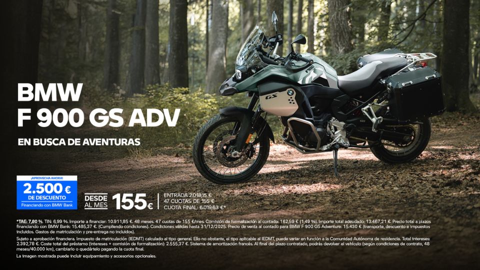 La BMW F 900 GS Adventure está hecha para quienes buscan ir más lejos. Potencia, control y espíritu explorador en cada ruta. Ahora, con 2.500 € de descuento y cuotas desde 155 €/mes financiando con BMW Bank.