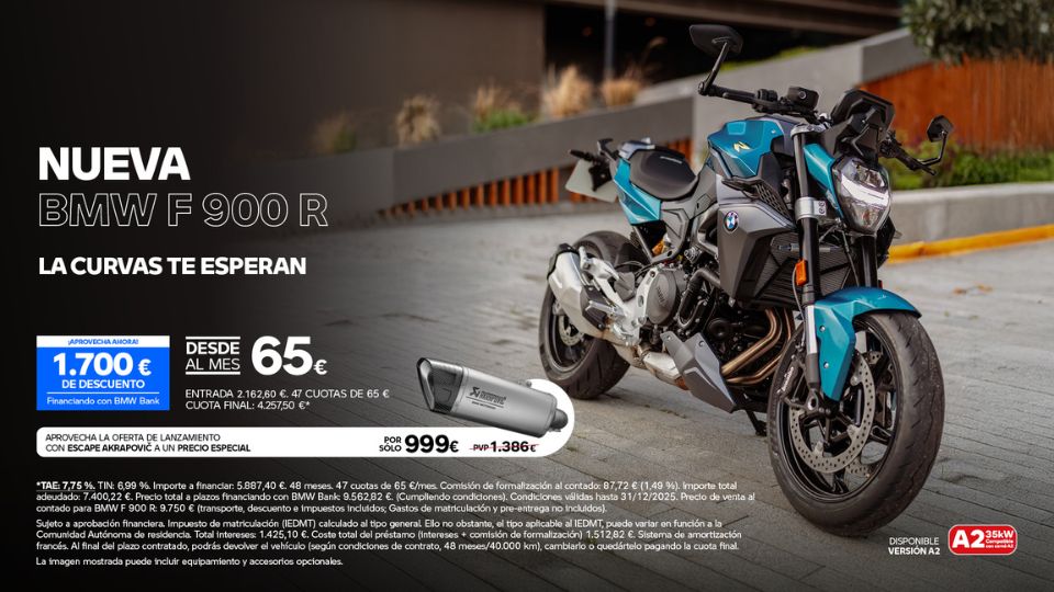 La nueva BMW F 900 R está lista para cada curva. Potencia, agilidad y un diseño que invita a disfrutar de la carretera. Ahora con 1.700 € de descuento y cuotas desde 65 €/mes financiando con BMW Bank.