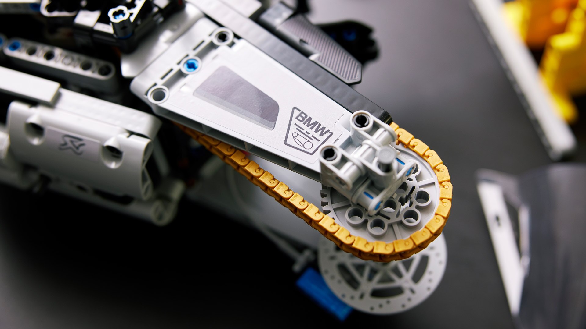 La escala de 1:5 fue todo un reto para los diseñadores. Sin embargo, también les ha permitido reproducir con más precisión que nunca el trazado de líneas, la medida angular y los componentes específicos del M RR. Cada elemento debía encontrar su correspondencia con el original, hasta las piezas de carbono y las piezas fresadas del exclusivo paquete M Competition. Solo la suspensión delantera y trasera soportan 1,4 kg de peso. Una auténtica ingeniería para la que se han construido nuevos elementos LEGO® Technic. Y también las llantas, los discos de freno y el parabrisas son fabricaciones especiales probadas antes de la producción en serie. Igual que con la auténtica M RR.
